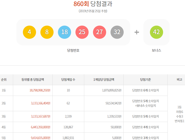 860회 로또당첨번호 당첨지역 결과발표가 금일 5월25일 토요일 저녁 8시45분에 MBC에서 방송 되었는데요, 860회 로로당첨번호는 4, 8, 18, 25, 27, 32 보너스번호는 42로 1등 당첨자는 총 10명 입니다.