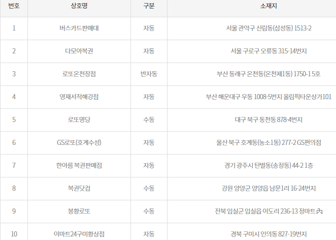 860회 로또당첨번호 1등 당첨지역 입니다. 서울 관악구 신림동에서 자동, 서울 구로구 오류동에서 자동, 부산 동래구 온천동에서 반자동, 부산 해운대구 우동에서 자동, 대구 북구 동천동에서 수동, 울산 북구 호계동에서 자동, 경기 광주시 탄벌동에서 자동, 강원 양양군 양양읍에서 수동, 전북 임실군 임실읍에서 수동, 경북 구미시 인의동에서 자동까지 각각 다른지역에서 860회 로또당첨번호 지역이 나와 총 10지역 입니다.