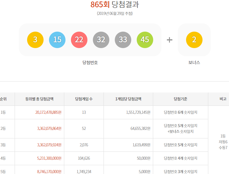 안녕하세요? 제가 사는 지역에는 장마기간 영향을 받아 계속해서 비가 내리고 있네요, 오늘 발표한 865회 로또당첨번호 지역 함께 확인할게요. 1등 숫자는 3, 15, 22, 32, 33, 45이며 2등에 보너스번호는 2입니다.