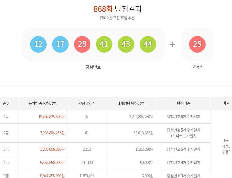 868회 로또 당첨 번호 1등 숫자는 12, 17, 28, 41, 43, 44이며 자동 3명 수동 3명의 당첨자로 1명당 약 32억원의 당첨금이 지급되며, 2등 당첨자수는 총 61명 1명당 5,301만원의 당첨금, 3등 당첨자수는 총 2,152명으로 1명당 당첨금은 약 150만원이 지급됩니다.
