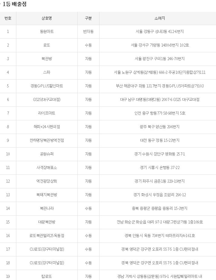 나머지 876회 로또 당첨지역은 서울 강동구 성내동에서 반자동, 서울 강서구 가양동에서 수동, 서울 광진구 구의동에서 자동, 서울 노원구 상계동에서 자동, 부산 해운대구 좌동에서 자동, 대구 남구 대명동에서 자동, 인천 중구 항동에서 자동, 광주 북구 양산동에서 자동, 대전 동구 정동에서 자동, 경기 수원시 장안구 영화동에서 자동, 경기 시흥시 은행동에서 자동, 경기 파주시 금촌동에서 자동, 경기 화성시 우정읍에서 자동, 충북 증평군 증평읍에서 수동, 전남 화순군 화순읍에서 자동, 경북 안동시 옥동에서 수동, 경북 영덕군 강구면에서 수동이 2장이나!! 경남 거제시 상동동에서 자동으로 총 18곳의 876회 로또 당첨 번호 당첨지역이 나왔답니다.